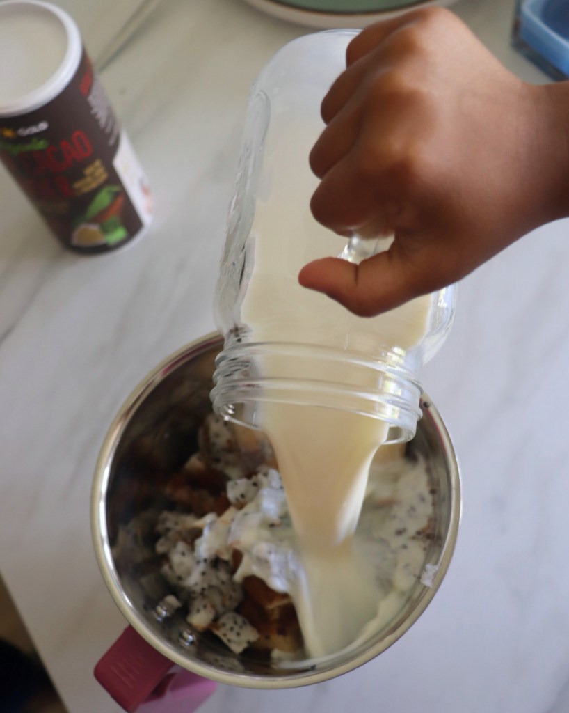 2.Place the diced dragon fruit, frozen banana, and milk into a blender. Blend until a dense, velvety consistency is achieved.