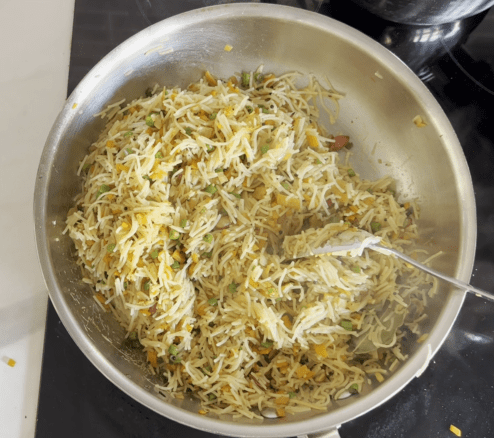 - Add the previously cooked semia into the pan and mix it thoroughly until it is well combined.