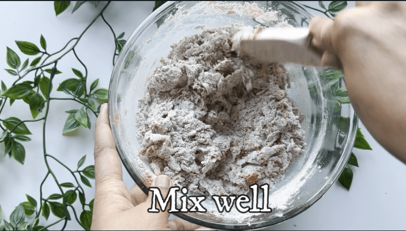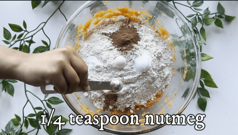 - Then add whole wheat flour, baking powder, baking soda, salt, cinnamon powder, and nutmeg powder. Mix well.