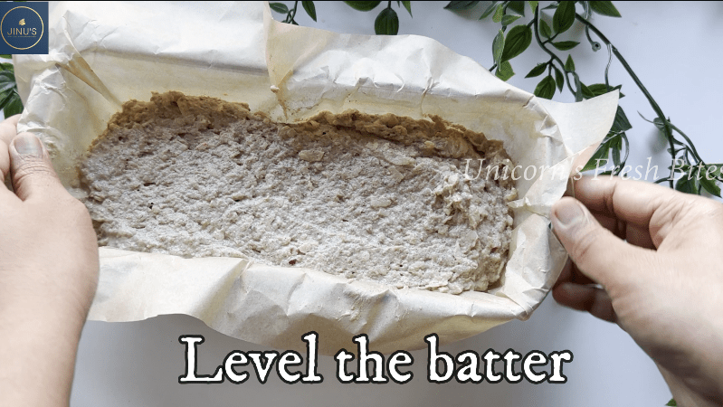 - Pour the batter into the prepared loaf pan, spreading it evenly. You can add 2-3 drops of oil for spreading the batter easily.