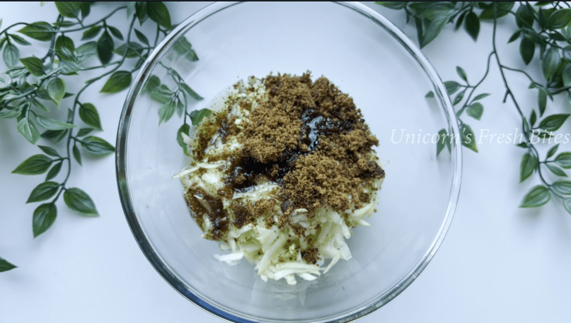 - In a large mixing bowl, combine the grated zucchini, jaggery, olive oil, milk, and vanilla extract. Mix well until everything is evenly combined.