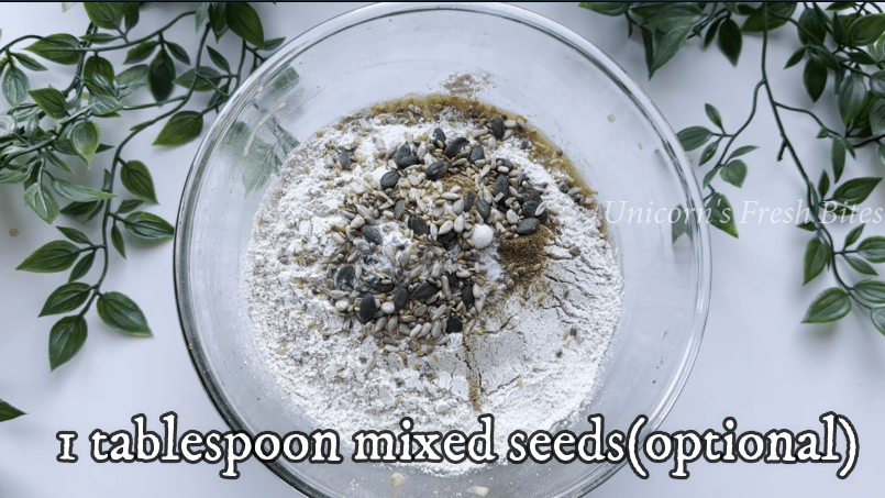 3.Add the whole wheat flour, baking powder, baking soda, cinnamon, nutmeg, and salt. You can add mixed seeds or chopped nuts(optional). I added 1 tablespoon of mixed seeds. Mix well and do not over mix.
