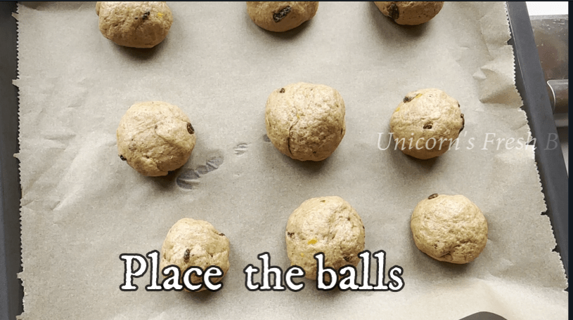 - After the dough has risen, punch it down and you can add raisins. and divide it into equal-sized balls. Place them on a greased baking tray, cover again, and let them rise for another 30-45 minutes.