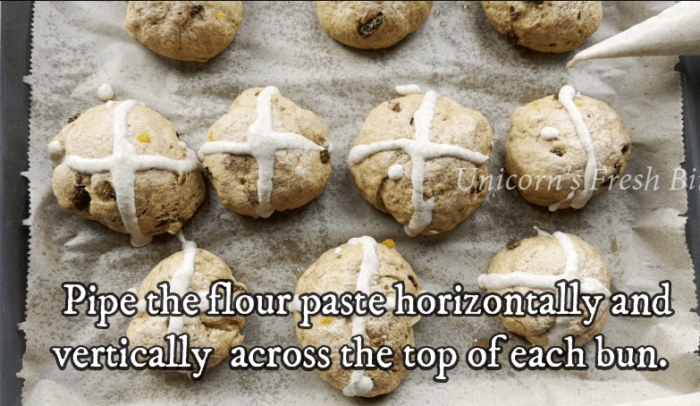 - In a small bowl, mix the plain flour and water to form a paste for the cross. Pipe this mixture onto the buns in the shape of a cross.