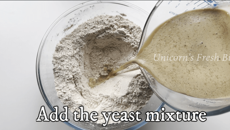 3.Add the frothy yeast mixture, oil/butter/ghee, and orange zest to the dry ingredients.