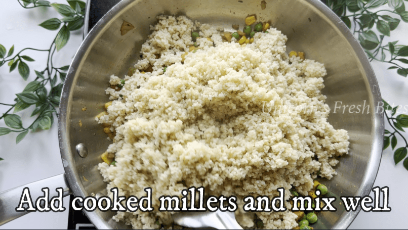 8.Then add cooked millet into this vegetable mix and mix well until well combined.