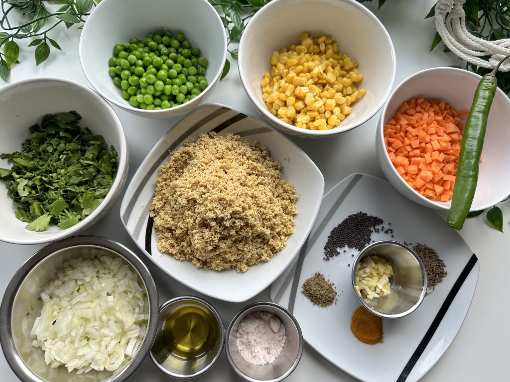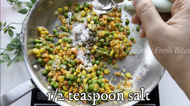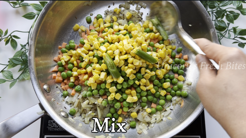 - Next, saute chopped onions until soft, then add chopped carrots, green peas, corn, and green chilies, mixing well.