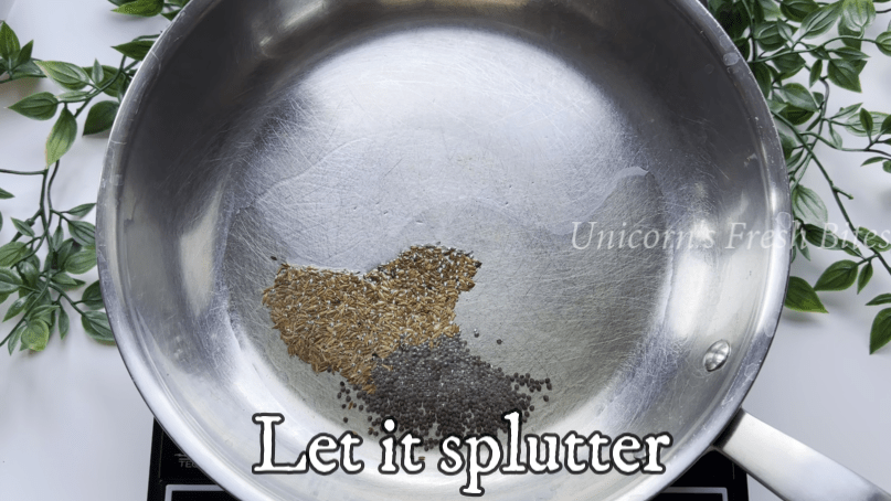 - In another pan, heat 1 tablespoon of oil and add 1/2 teaspoon of cumin seeds and 1/2 teaspoon of mustard seeds, allowing them to splutter.