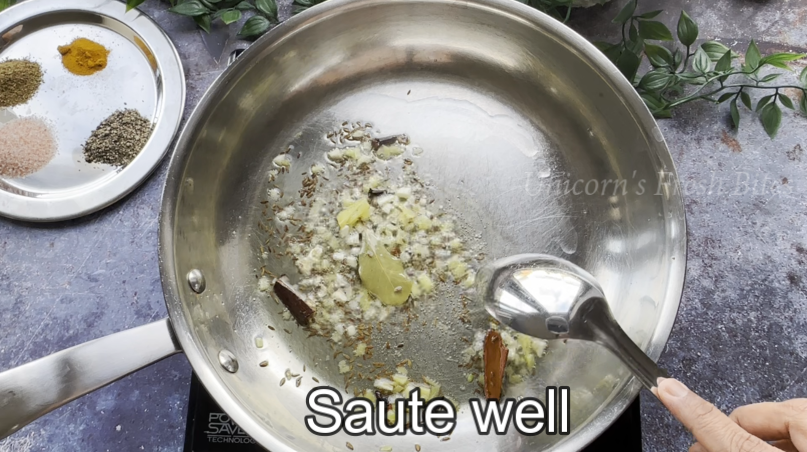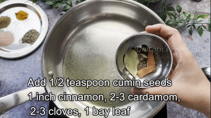 - 1 teaspoon cumin seeds, 1 inch cinnamon stick, 1 bay leaf, 2-3 cardamom pods, 2-3 clove