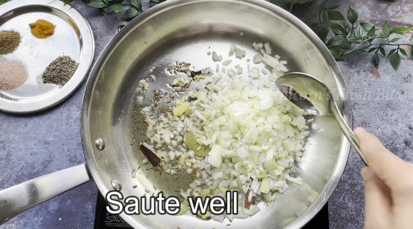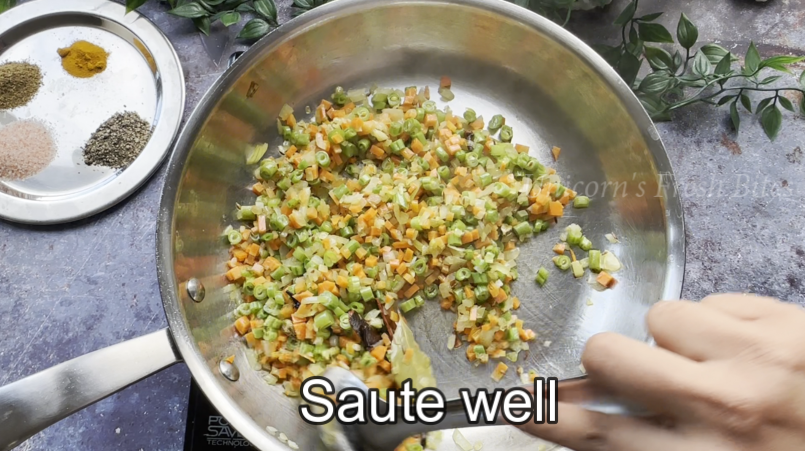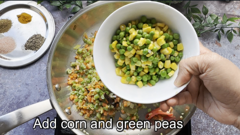 3.Prepare the vegetables – In a pan, heat 1 teaspoon of oil. Add 1 teaspoon of cumin seeds, 1 inch of cinnamon stick, 1 bay leaf, 2-3 cardamom pods, and 2-3 cloves. Sauté until they release their aroma. Then, add 1 tablespoon of chopped ginger and garlic, 1 chopped onion, 1/4 cup chopped carrot, 1/4 cup chopped beans, 1/4 cup chopped capsicum, 1 green chili, and 1/2 cup corn and green peas. Cook until the vegetables are tender. You can add vegetables of your choice.