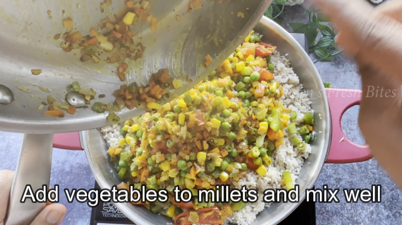 5.Combine the millets and vegetables – Once the millets are cooked, add them to the pan with the cooked vegetables. Mix well. Add a handful of chopped coriander leaves. Stir everything together and cover and cook for a few minutes in low flame.