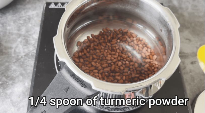 2.Cook the Red Cowpeas: In a cooker add 1 cup of soaked red cowpeas along with 2cup of water,1/2 tsp turmeric powder,1/2 tsp salt. Pressure cook until 4-5 whistles or until its soft. Drain and set aside.