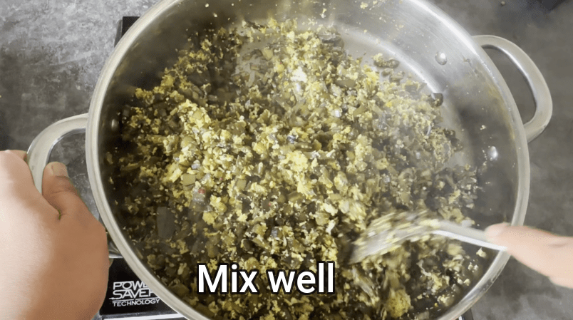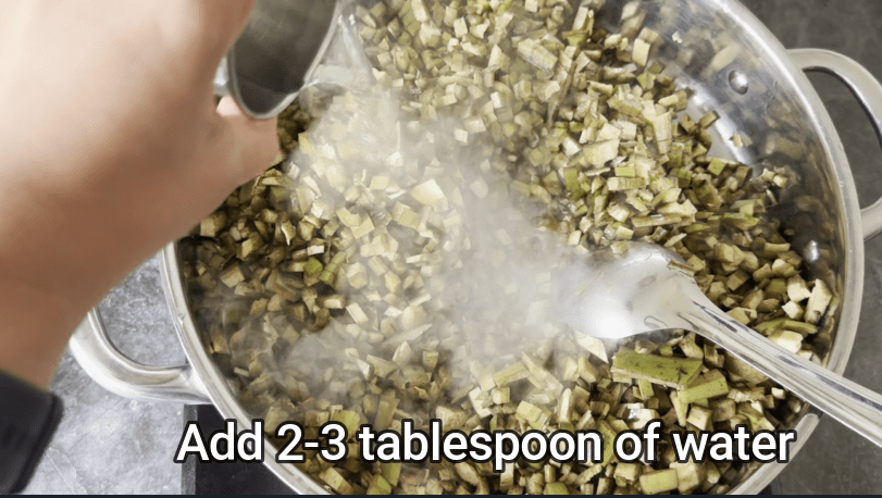4.Stir-fry the Ingredients: Heat the coconut oil/ any oil of your choice in a pan. Add mustard seeds and let them splutter. Then, add the chopped and washed banana peels, add 2-3 tablespoon of water, and sauté for a few minutes. Add the turmeric powder and salt. Mix well. Cover and cook until its soft. Stir occasionally to avoid burning.