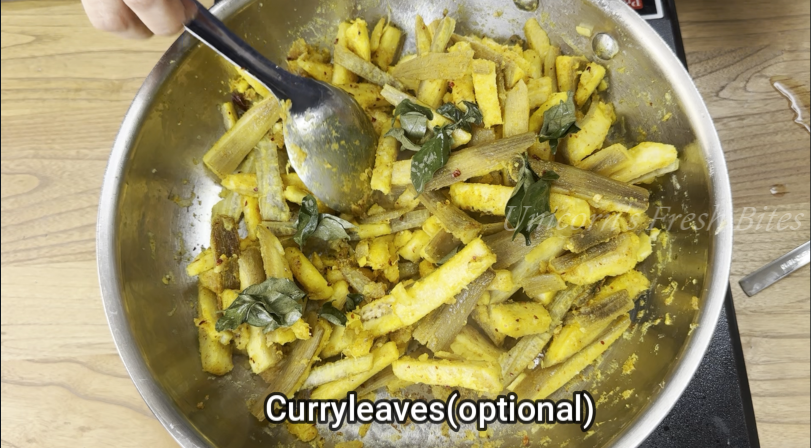 4.Heat 1 to 2 tablespoons of oil in a pan, then toss in some aromatic curry leaves, a sprinkle of chili flakes, and the steamed banana pieces. Season with salt and turmeric powder, and sauté until everything gets a delightful crispiness!