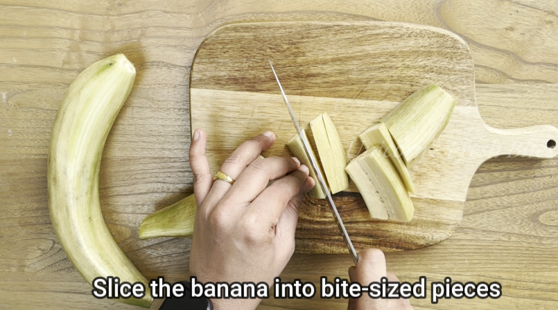 2.Slice the banana into bite-sized pieces and give them a refreshing rinse in cold water—drain at least three times to get them nice and clean