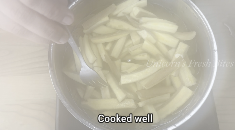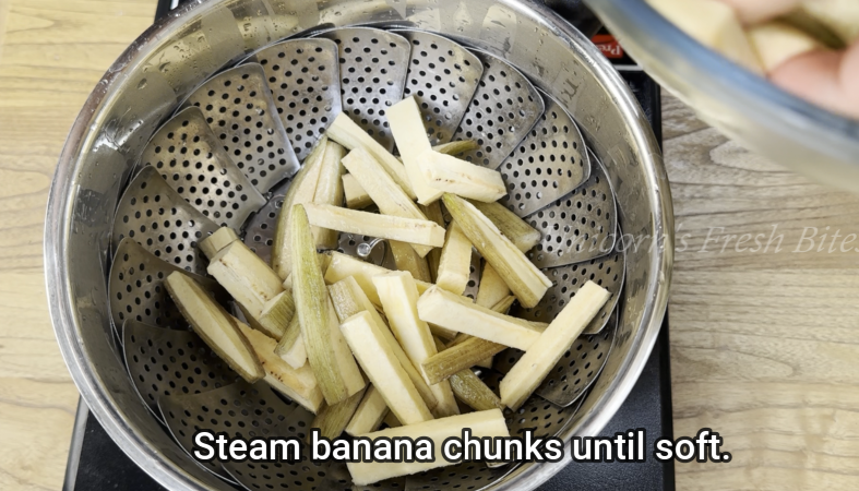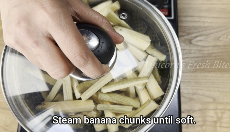 3.Once drained, steam those banana chunks until they’re perfectly soft and tender.